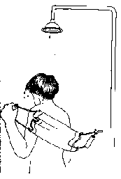 A bathing sponge on a plastic or bamboo stick can be used to wash one's back when one is unable to reach it because of restricted mobility. Use an electricity pipe or bamboo stick that has been bent by careful heating and glue the sponge onto it. It is even more convenient to use a bent stick with a small hole in it, so that a rope can be used to attach the sponge. In that case the sponge can be replaced easily when spoilt.