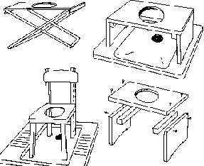A person who cannot squat on a latrine can use various types of seats that are easy to take away by other users. A child with uncontrolled movements can sit in a small-size car tyre. Other possibilities are different types of low or high stools with a circle sawn out from the seat. In large families, a foldable stool is practical.