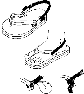 If someone has difficulty walking properly on slippers due to uncontrolled leg movements, this heel strap is very useful. Take a piece of inner tube tyre or any other soft but strong material, and tie it to the sides of the slipper. You can also sew it on.