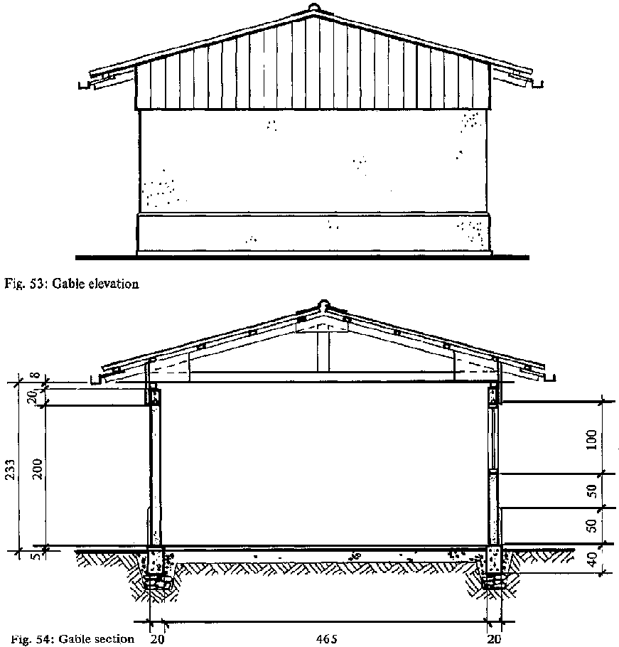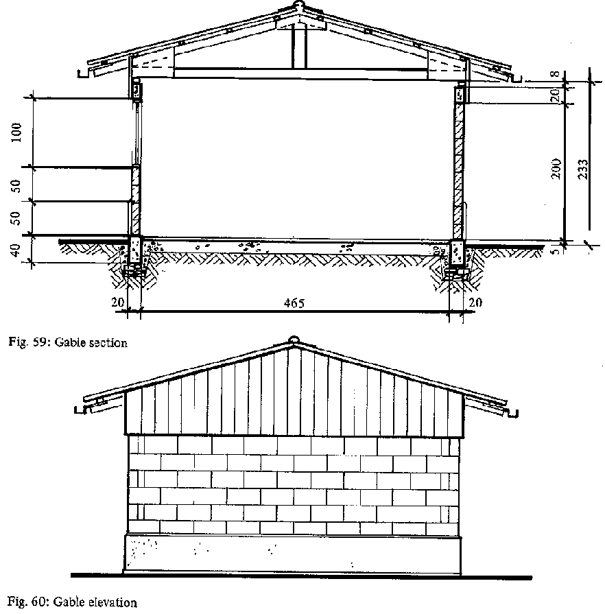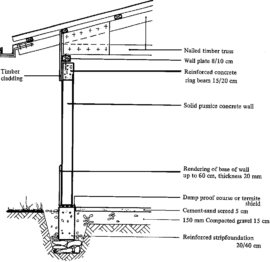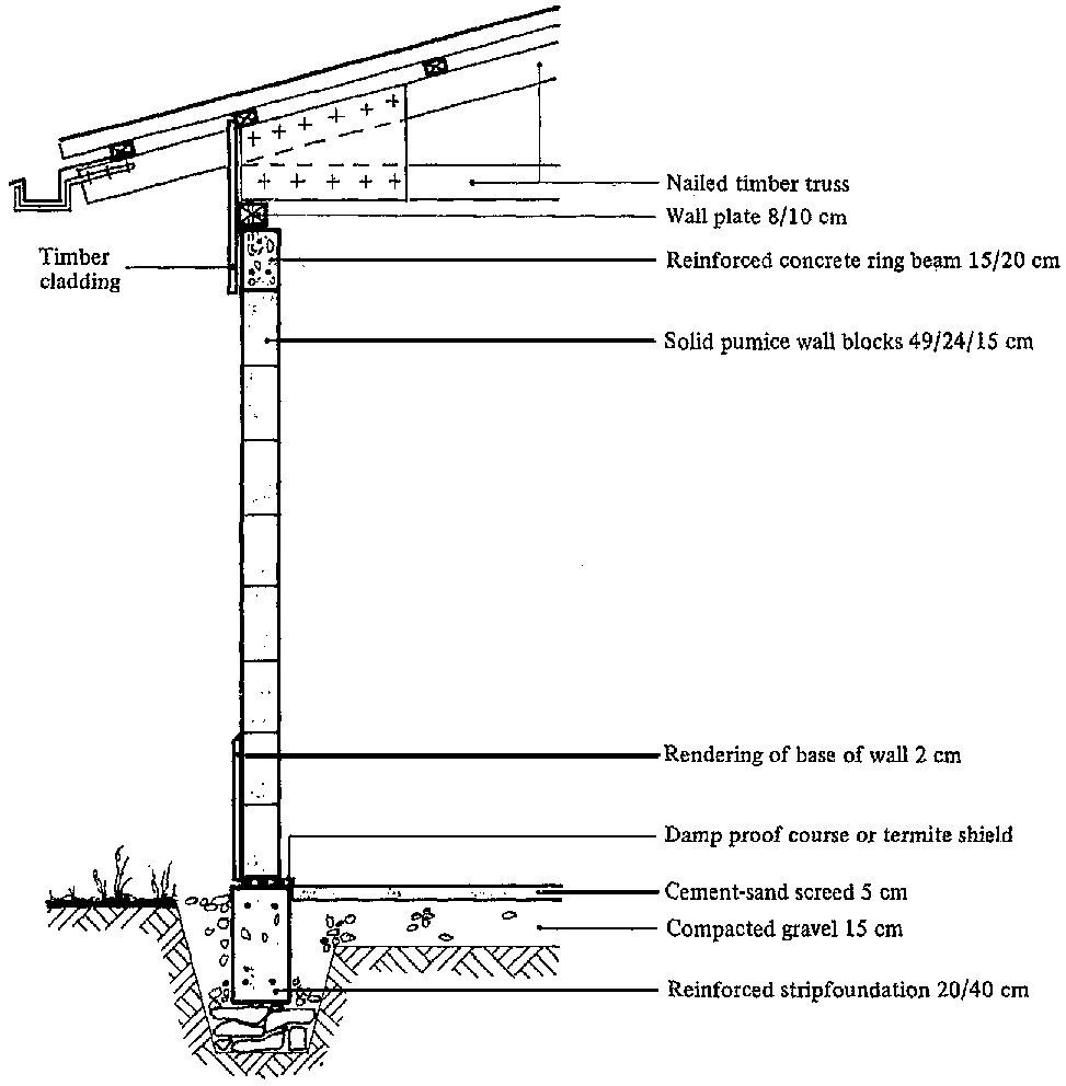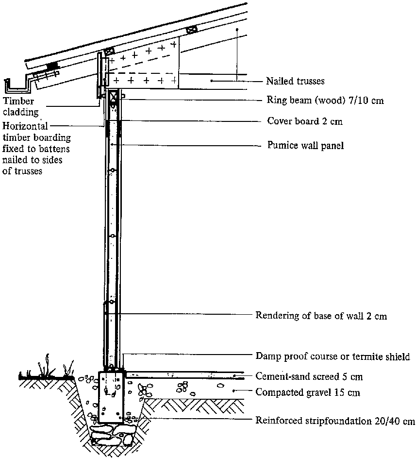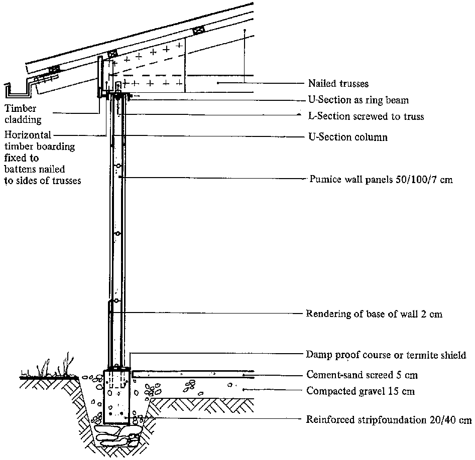 This house has load-bearing walls made of in-situ cast pumice concrete. It rests on a reinforced concrete strip footing (normal -weight concrete, not pumice concrete) or on a natural-stone masonry foundation. The in-situ pumice-concrete walls are erected directly on the foundation. They are 15 to 25 cm thick and, to the extent necessary, reinforced with steel to provide protection against earthquakes. The massive walls can be rendered/plastered or smoothed with several coats of paint. The door and window openings are simply left free, and the door -and window cases are embedded in the concrete. In-situ concrete walls have the advantage of not requiring prefabrication (like bricks or panels). On the other hand, they do require the installation of wooden form work to contain the concrete - which in turn involves extra expense, work and prior knowledge (Fig. 50). The roof substructure consists of lattice steel or wooden beams. The roof skin can be made of galvanized corrugated sheeting screwed down on wooden laths, although any other kind of roofing would also be suitable, e.g. clay roofing tiles, straw and reed, etc. The solid walls are strong enough to accommodate a ceiling for the possible subsequent addition of a second story. The floor is made of thin concrete screed on a layer of sand and gravel. Wooden or steel frames hinged to the concrete - embedded cases are recommended for the windows and doors.