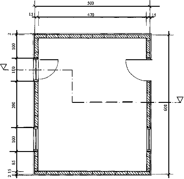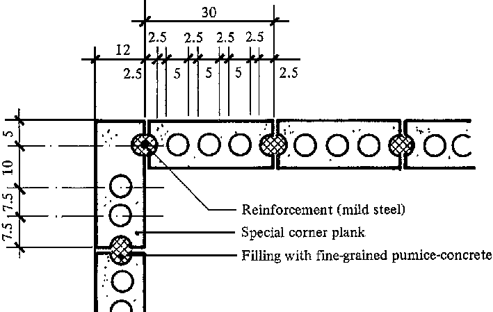 hollow-core plank walls, 10 cm thick, i.e. 38 hollow-core planks measuring 220 × 50 × 10 cm and comprising 3.42 m³ pumice concrete (approx. 500 kg or ten 50-kg bags of cement) | |