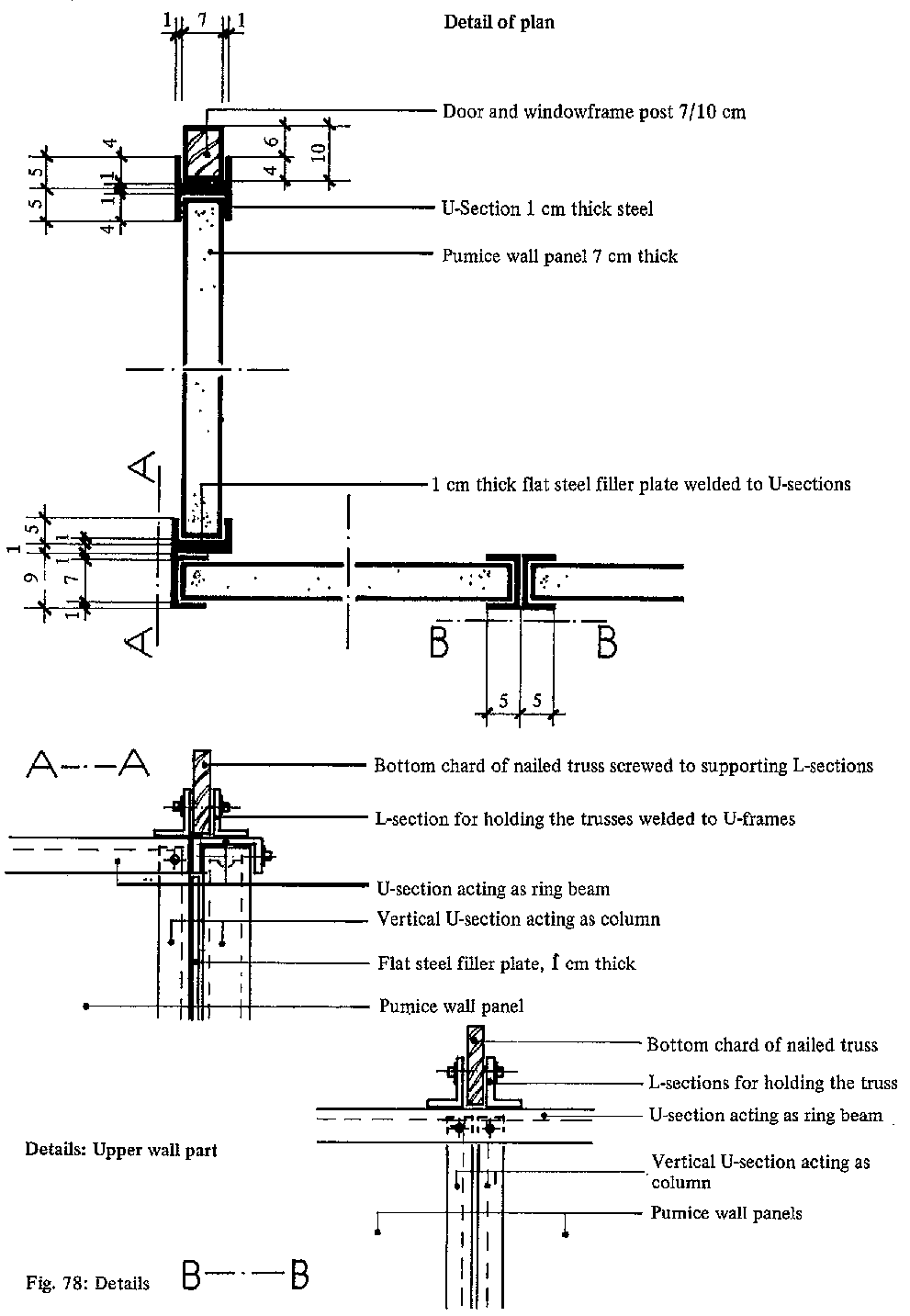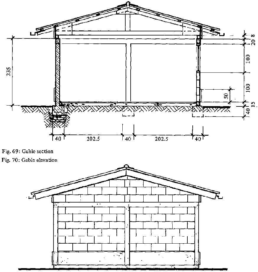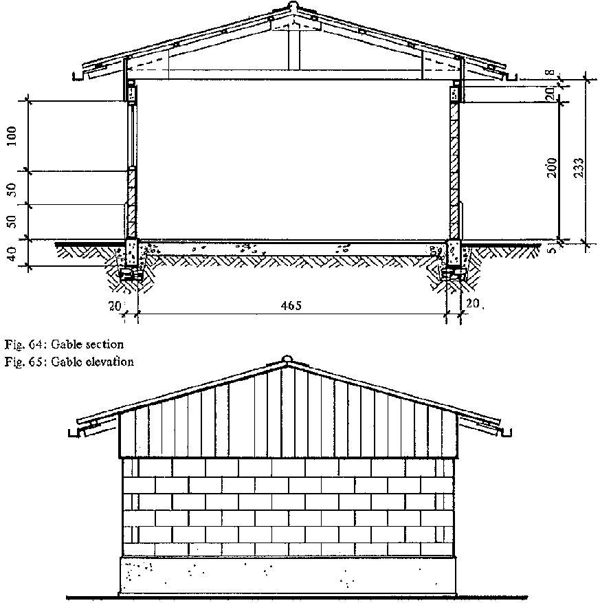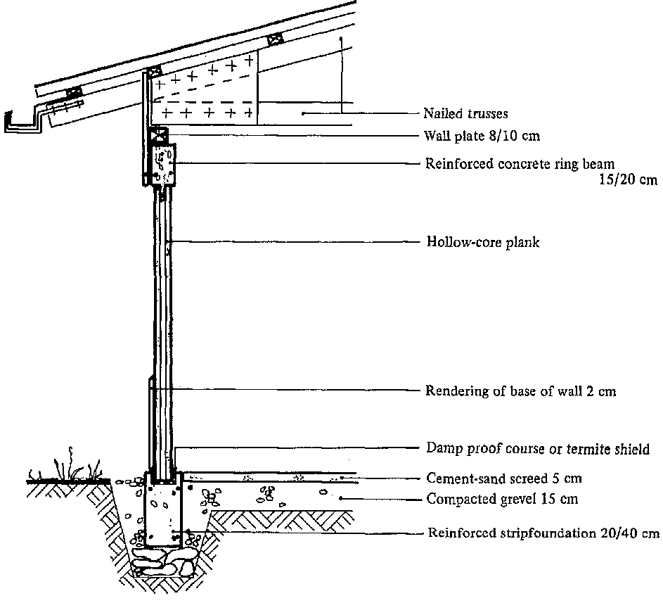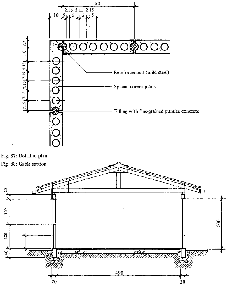 The house needs a solid natural-stone or reinforced-concrete foundation. The planks are easy to make, once a good set of molds has been prepared (cf. Chap. 3.2.5). It is important that the planks be cast properly and true-to-size, otherwise they may not fit together. Placing consists of erecting one plank after another, beginning at a corner of the house and propping each plank with wooden stays. As soon as one side of the house and its two corners are standing, the joints between the planks can be grouted with thin pumice-concrete containing only very small aggregates. Care must be taken to ensure that the entire joint is properly filled and compacted from top to bottom. A continuous tie beam made of normal-weightconcrete must always be installed around the top of the walls to help hold the planks together. The roofing can consist of any preferred material.