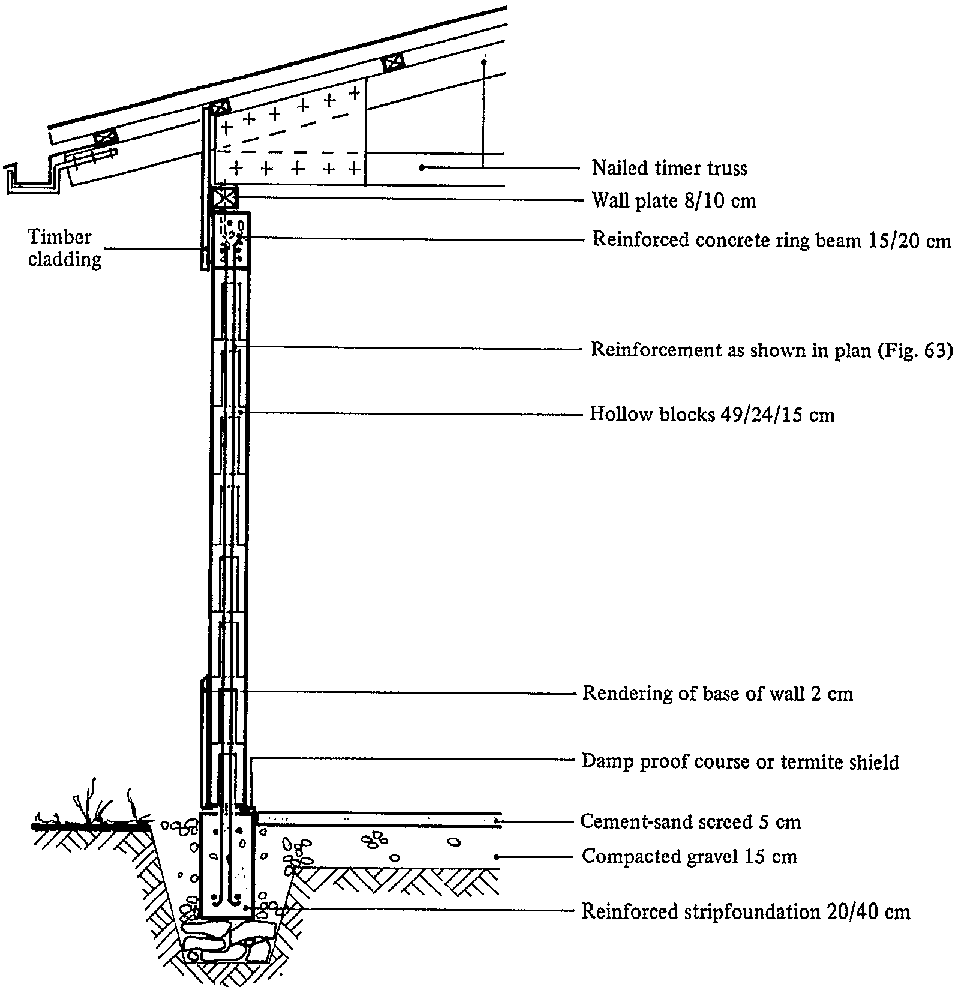The strip footing can be made of in-situ normal-weight concrete or of natural stone masonry, as long as it is strong enough to carry the weight of the walls. First of all, the blocks/bricks for the walls have to be made. Fifty bricks measuring 25 × 11.5 × 7 cm will produce one square meter of wall with a thickness of 11.5 cm. Only 7 blocks measuring 49 × 30 × 11.5 cm are needed per square meter wall area with a thickness of 11.5 cm. The pumice-concrete bricks are very light and therefore quick and easy to place. Care must be taken to ensure that the walls have the proper masonry bond and are exactly vertical (Fig. 57). It is important to remember that pumice bricks have to be dipped in water prior to use to keep them from absorbing the gauging water and setting too quickly, which would result in very unstable joints. The walls of the house can be rendered/plastered, and plinth rendering to a height of 30 -50 cm is recommended in any case.