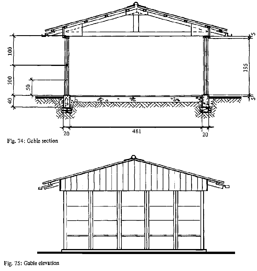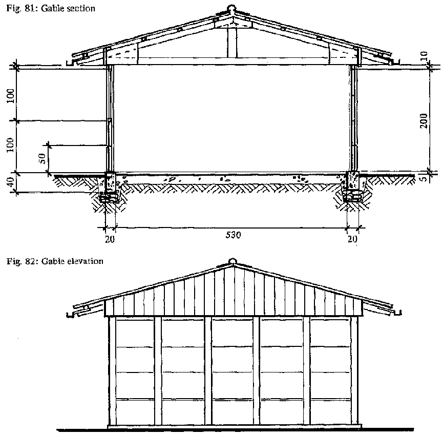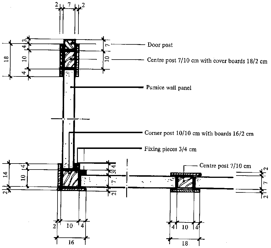 This house is built according to the same basic system as the preceding house, except that the frequently very expensive steel channel sections are replaced by relatively inexpensive wooden posts and beams. While the model house has corner posts measuring 10 × 10 cm and intermediate/interior posts and tie beams measuring 7 × 10 cm, the wooden-post cross sections ultimately depend on the thickness of the pumice-concrete panels. The posts should consist of sawn wood that has been treated against pests with chemical agents, tar, used oil, lime, saltwater, etc.