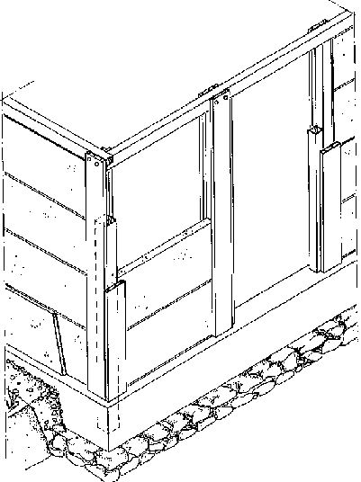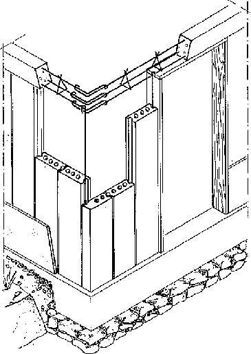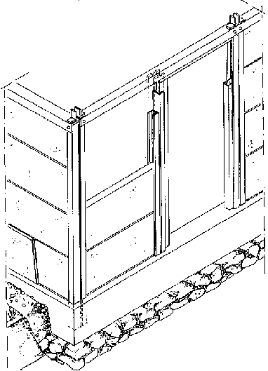 Cutouts of adequate size are left for the wooden posts in the natural-stone or concrete strip foundations. The posts are inserted into the cutouts and wedged in place. Later, the cutouts are filled with concrete. Thin laths nailed onto the wooden posts hold the panels in place. One lath can be left out at first to allow easier stacking of the panels. Only when all of the panels are in place and properly aligned should the last lath be nailed on. The horizontal joints between the panels can be closed with mortar (= grout).