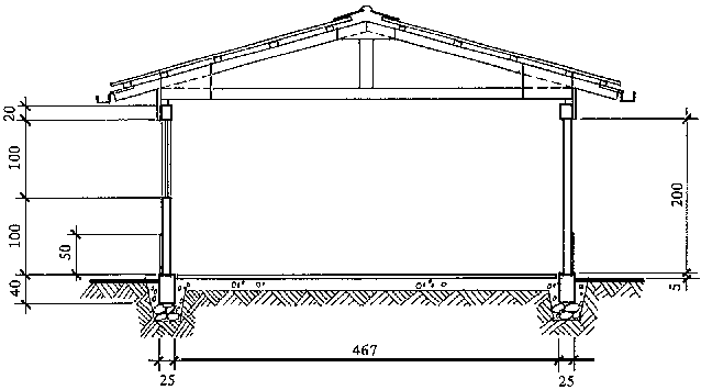 The house rests on reinforced-concrete isolated or strip foundations with encastre concrete columns. The pumice-concrete cavity blocks fill out the spaces between the columns. The floor of the model house consists of a layer of sand and gravel topped with a thin layer of concrete screed. The roof substructure is made of lattice steel or wooden beams. The covering may consist of roofing tiles' sheet zinc or corrugated asbestos sheet on wooden laths. The window and door openings have built-in cases made of square timbers or steel. The door leafs and window sashes are hinged to the case frames.