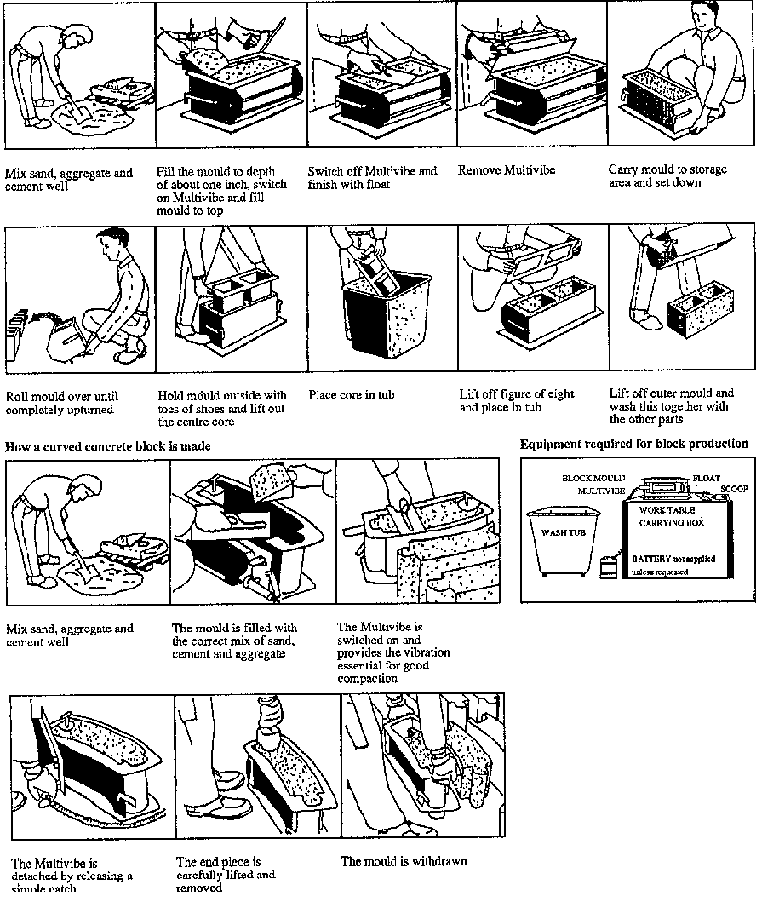 The Multivibe is a multi-purpose, detachable vibrating machine for the small-scale production of concrete blocks and a large variety of other concrete building components. It is a portable machine which can be operated from any angle and can be clamped to a wide variety of forming tools, such as concrete block moulds, rooftile screeding machines, table surfaces or to the shuttering for'in situ' concrete work.