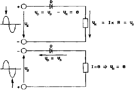 a) rectifier loaded by a resistor:In forward direction the current flows through the diode, causing almost no voltage drop at the diode. In reverse direction there is no current flowing through the diode, but the total voltage drop at the diode is equal to the supply voltage.