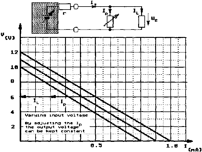 Here the overall current drawn from the supply will be kept constant by a component giving way for a current in a second path as soon as the voltage tends to increase above 6 V.