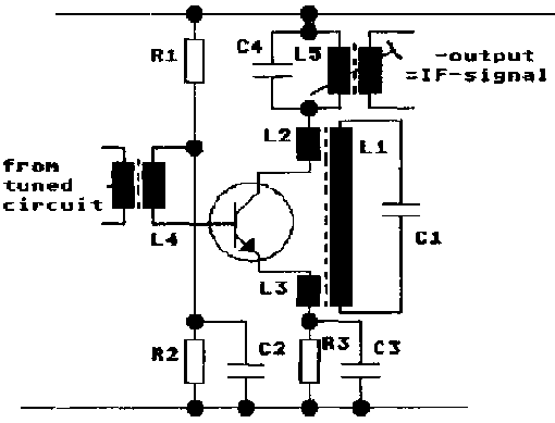 The circuit selects via C4 and LS the intermediate frequency which is produced via the mixing process as well and feeds the IF via the tuned circuit L5 and C4 to the next amplifier stage.