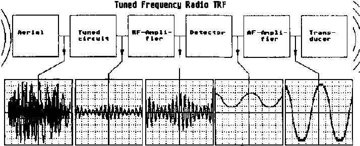 If a single amplifier stage has to amplify which very high amplification, it tends to produce oscillations itself, therefore it produces distortion itself. So the next step was to built in a second amplifier, but now one which was amplifying the still modulated signal appearing just out of the tuned circuit. This amplifier was called the RF-amplifier. The result was the a so-called TUNED FREQUENCY RADIO RECEIVER or TRF-receiver which was used from about 1930 till 1950.