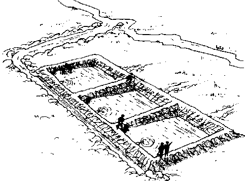 37. As you dig the soil out, put it on the 2- metre strips to be the banks of the pond.