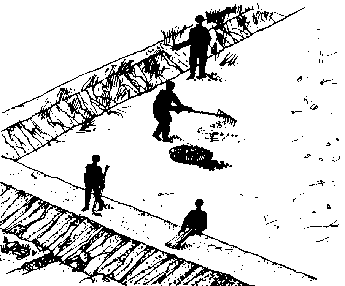 148. If there are any water leaks in the banks or around the inlet, outlet or overflow, stop them by packing them with good clay soil.