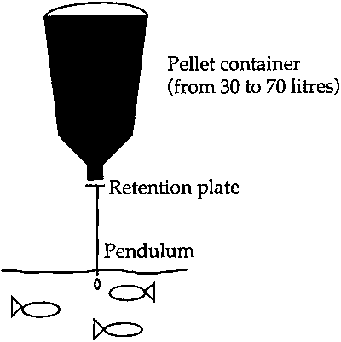 For smaller fish, clockwork-driven belt feeders are often used. This is basically a container equipped with a belt that is rolled by clockwork action10 on an axis. Feed is placed on the belt that is going to roll up progressively during 10 hours (clock system) on its axis, releasing the feed slowly. It is a system that is particularly well adapted to small fish. These feeders can distribute 5 to 10 kg of food per day.