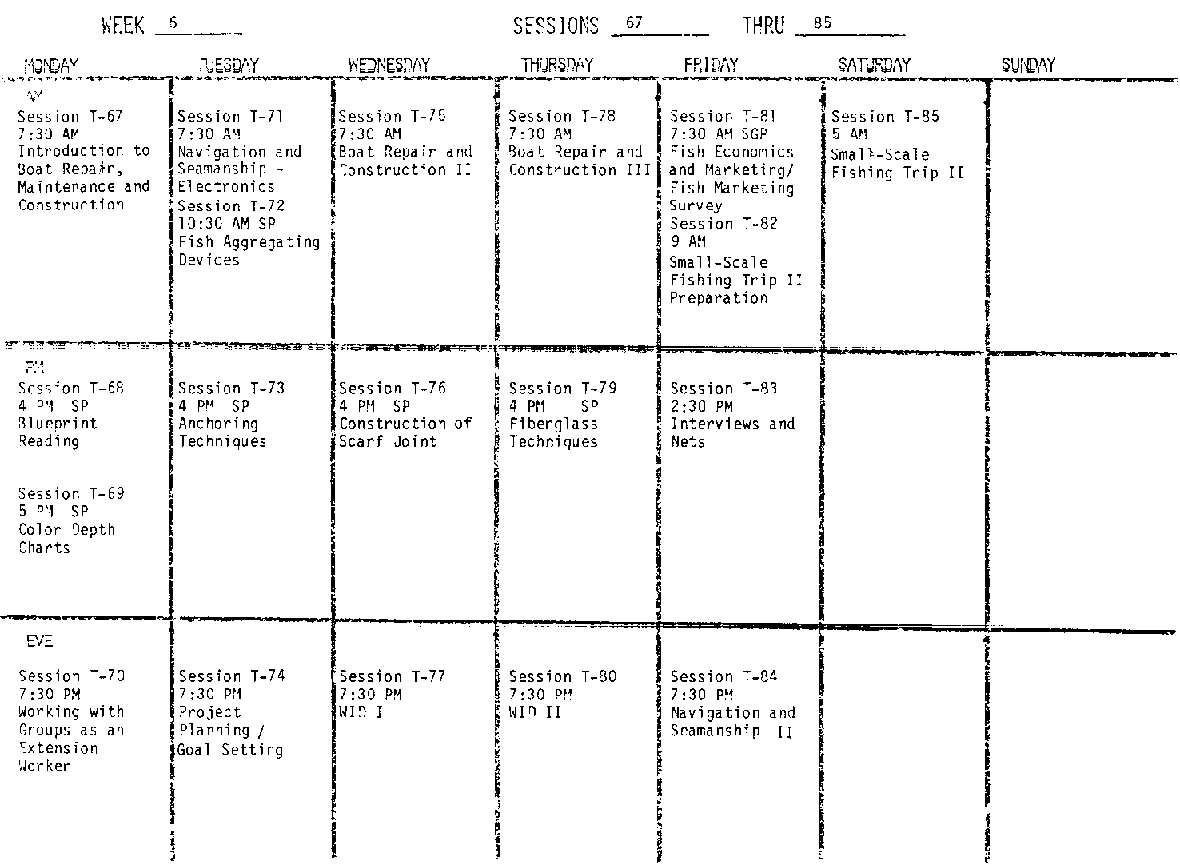This session is to be done as a special group project by a group of trainees with a trainee group leader. The PCV in-country will be involved primarily with the economics of the local small-scale fishery. The marketing aspect has been given a low priority in previous years. It is the responsibility of the PCV to be aware of minor and major shifts in the local fish market price structures - both current and past, in order to determine preferences in the local community/region for fish - processed, unprocessed, etc. By ascertaining the local preferences - new fish types, different processing styles, techniques can be developed to enhance the marketing of fish. This special group project is involved with collecting data from local fish markets, fish sellers and fishermen.