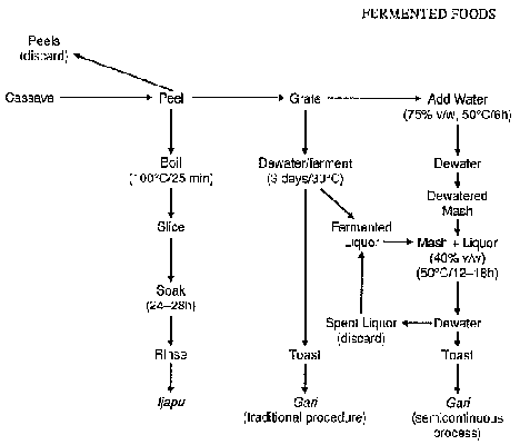 Processing conditions for optimizing the fermentation process have been investigated in our laboratory. We found that the temperature range of 30° to 35°C, with a soaking period of 48 to 60 hours, is best for submerged processing. The size to which the roots are cut, peeling or nonpeeling of roots before processing, changing or nonchanging of fermentation water at intervals during processing, and the age of roots all affect the characteristics of the final product. In addition, the protein contents of products can be improved by cofermentation with legumes such as soybeans and cowpea.