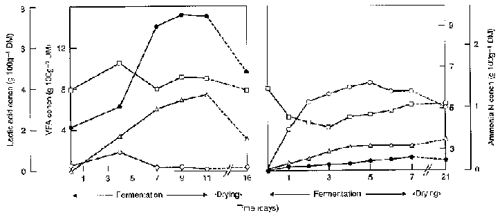 --, pH; -·-,VFA concentration; -O-, Am, lactic acid concentration; Am, -D- ammonia-N concentration