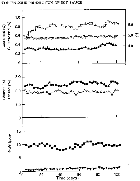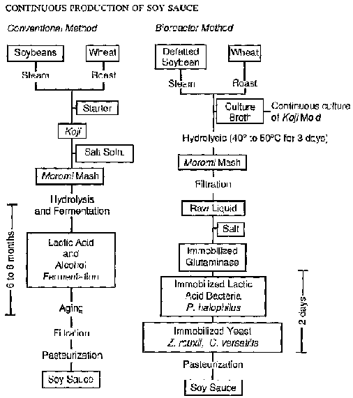 The total time required for the production of soy sauce by the bioreactor system, including enzymatic hydrolysis of the raw materials, fermentation with immobilized whole cells, and the refining process, is only about 2 weeks (2). This is considerably shorter than the 6 months with the conventional method of soy sauce brewing consisting of koji making, fermentation and aging of morons, and refining.