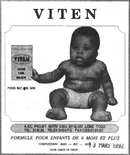 · L'étiquette doit être conçue avec soin . Le mode d'utilisation de la farine de sevrage doit être clairement expliqué (proportions à respecter, temps de cuisson...), soit par écrit, soit sous une forme imagée. Bien souvent, elle est illustrée avec le dessin d'un enfant en bonne santé.