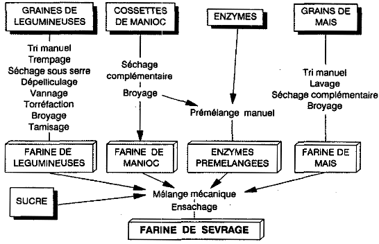 Les ingrédients sont mélangés puis passés dans le moulin à disque. La mouture est ensuite conditionnée dans des sachets plastiques fermés à l'aide de la thermosoudeuse: emballage bleu pour les enfants de 3 à 6 mois, rose pour la farine de deuxième âge. Une date limite de vente fixée à 4 mois est indiquée sur le sachet.
