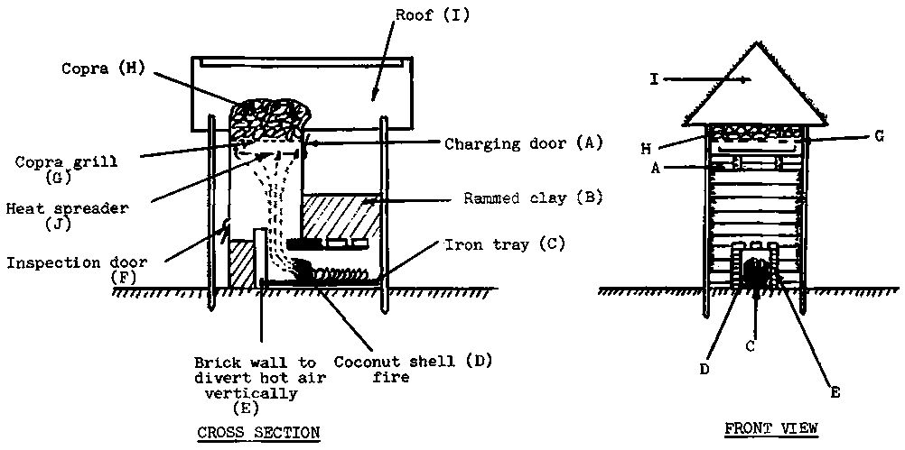 When predrying in the husk, the hot, moist air passing through the newly stacked husks will be fairly cool on reaching the cut-out, partly dried copra in the upper racks and will condense. This will not be the case, however, if the furnace has been fired and the heating chamber sufficiently heated prior to stacking the half nuts in the husk in the drier. It is therefore important to fire the furnace and heat the drier about an hour prior to stacking husks for predrying.