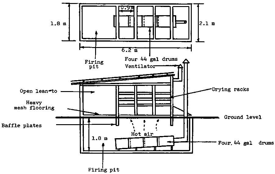 The drying chamber is built of local timber directly over the heating chamber. The flooring at ground level is heavy 5 cm wire mesh, which will support half nuts in husk. The upper portion has three compartments, each with five racks carrying 1.25 mm2 wire-mesh trays measuring 1.8 × 0.9 m - a total of fifteen trays in all. Trays can be made smaller (0.9 m square) with two trays in each rack for easier handling. Three hinged doors on one side are used for charging and discharging husks and trays. The walls and doors are made from empty drums.