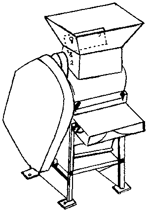 The hopper at the top of the machine is filled with nuts to be shelled. A ribbed feed roller feeds the nuts into the beater chamber where they are struck by rotating flexible beaters. The broken shells and the kernels are forced out through the perforated cylindrical steel shelling screen (available in three sizes). The kernels and broken shells fall into a duct which has a wire-mesh delivery chute at its lower end. A fan blows the shells upward and out of the shell outlet spout.