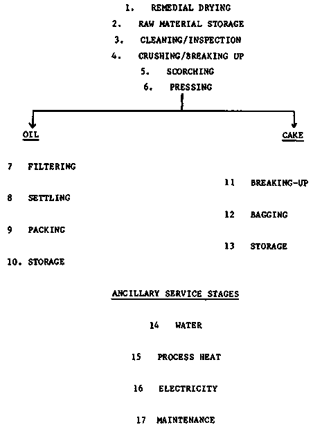 The sequence of the above stages are detailed in a flow chart (see table III.1). The various processes dealt with below follow the same sequence. These stages are described for the following six types of plants: micro-plant, power ghani mill, baby expeller mill, small package expeller mill, medium and large expeller mills, solvent extraction plant and wet-processing.