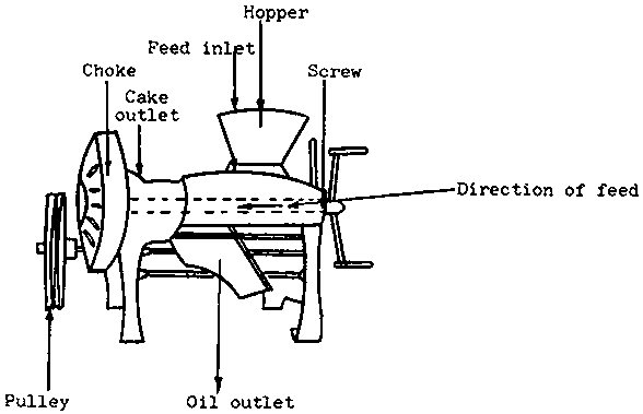 A motor-driven expeller capable of processing 120-140 kg/hour of raw material is required. A duplex unit is most suitable for this purpose. If a single expeller were to be used, it should have a power requirement of 5 hp and run at 350 rpm.