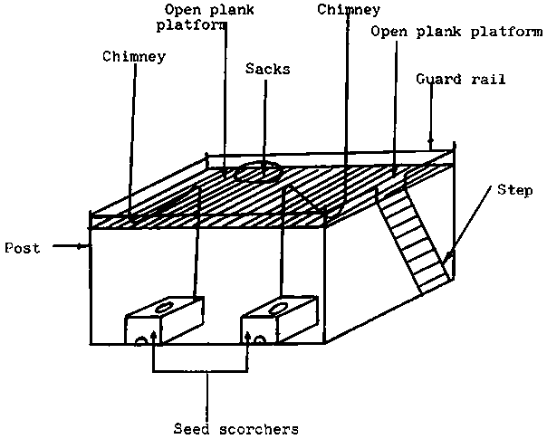 The method described in the previous plants may still be adequate. It may also be possible to employ a simple form of in-sack artificial drying by building a platform above the seed scorchers (see figure III.7).