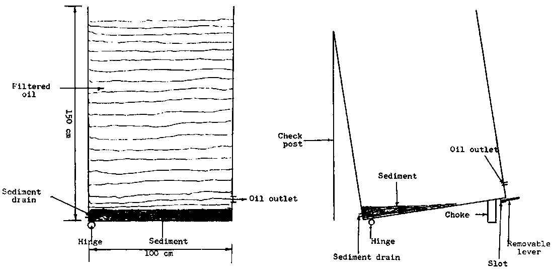 After the filtering, it is best to leave the filtered oil to settle for a couple of days. Two separate tanks are used for this purpose. Provision should be made for periodic draining of sediment through taps at the bottom of the tanks. The latter should be inclinable to facilitate this operation (see figure III.8).