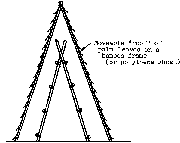Unhusked maize cobs are often tied by the tassels into small bundles and hung from trees or exterior house rafters to dry. Alternatively, simple racks, made from horizontal bars supported by inclined bamboo poles, may be used (see figure II.2). The cobs are hung from the horizontal bars by their tassels. In the event of a sudden shower, a similar but slightly taller rack covered with polythene sheeting or large leaves, can be placed over the first rack (see figure II.3).