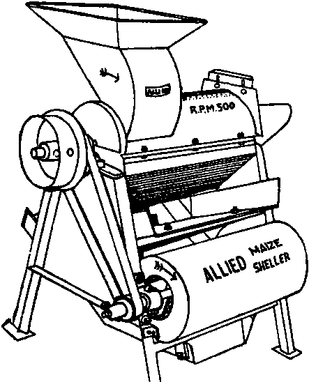 This sheller may shell husked or non-husked cobs. The revolving drum of the star and bar pattern, is flywheel-assisted and operates in conjunction with a hinged, stationary concave. The latter is spring-mounted at its outlet and is adjustable for varying sizes of cobs.The majority of shelled maize passes through the concave bars and over a dust-extracting sieve as it gravitates to the winnowing hopper beneath. Cobs and husk, delivered by the 390 mm wide drum, are thoroughly shaken by a spring-balanced reciprocating rack which is fitted with a perforated floor. Loose maize is separated from the refuse by the shaker rack and returned to the winnowing hopper.