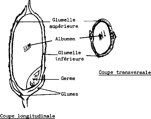 Les grains sont constitués de trois parties: les enveloppes, l'albumen et le germe ou plantule. Les figure II.1 à II.4 montrent ces différentes parties pour les grains de maïs, sorgho, riz et haricot.