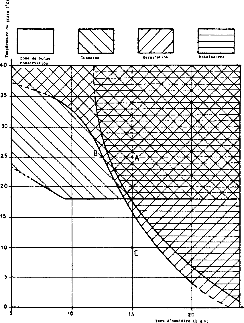 Les facteurs température et humidité sont étroitement liés. Les courbes d'équilibre hygroscopique air-grain indiquent en effet que plus la température est élevée, plus l'humidité du produit doit être faible pour assurer une bonne conservation. C'est pourquoi les taux d'humidité maximaux recommandés pour le stockage dans les régions chaudes sont toujours inférieurs à ceux retenus dans les régions tempérées ou froides. Le diagramme de conservation des céréales établi par Burgess et Burrel (voir figure II.9) donne les différents types d'altération possible, en fonction de la température et de l'humidité. Ce diagramme permet de vérifier que du grain à une teneur en eau de 15 pour cent et stocké à une température de 25°C (point A) va présenter des risques de développement d'insectes et de moisissures alors que s'il est stocké à cette même température, mais à une humidité de 12,5 pour cent, il est seulement exposé aux attaques d'insectes (point B). On note également que du grain à 15 pour cent d'humidité se conserve parfaitement s'il est stocké à 10°C (point C). En zone tropicale, on ne dispose généralement pas de températures aussi basses.