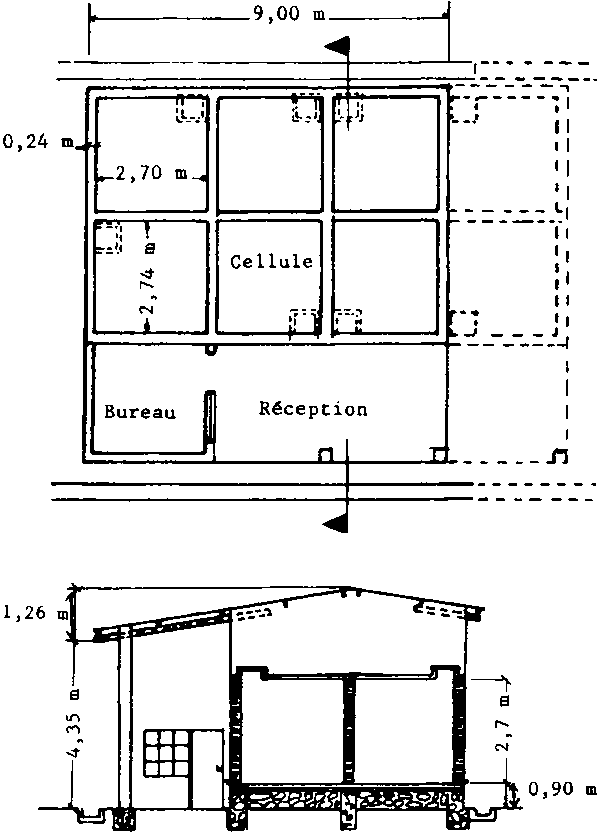 Le plan d'un des magasins établis par une organisation non gouvernementale1 est présenté à la figure IV.1. Il comprend plusieurs cellules de stockage en vrac de 20 m3 chacune. Les cellules ont une forme cubique de 2,7 m de coté. L'unité de stockage est équipée d'une aire de réception des produits et d'un petit bureau de 10 m2 environ. L'ensemble des installations est recouvert d'un toit. La construction peut être réalisée en briques cuites ou en parpaings de béton. Les cellules ont des murs de 30 cm d'épaisseur et des cloisons de 20 cm d'épaisseur. Elles sont fermées par une dalle percée d'un trou d'homme pour le remplissage. Une barrière pare-vapeur en bitume est intégrée à la dalle de fond afin d'éviter les tranferts d'humidité. Les murs extérieurs et intérieurs sont enduits de ciment additionné d'un produit hydrofuge.