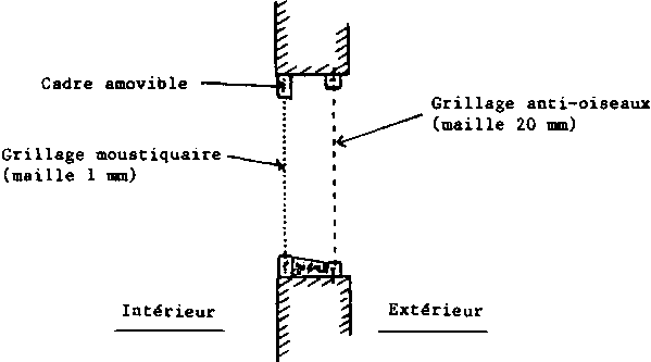 Les aérations basses ne sont pas conseillées car elles sont à l'origine de nombreux problèmes (entrée d'eau, de rongeurs par exemple). Elles doivent de préférence se trouver au faît des murs pour être protégées des pluies par les avant-toits. Ces ouvertures doivent être équipées d'un grillage anti-oiseaux et d'une moustiquaire fixée sur un cadre amovible, l'espace entre ces deux grillages devant être supérieur à 10 cm. La figure IV.7 fournit une représentation schématique d'une ouverture d'aération grillagée.
