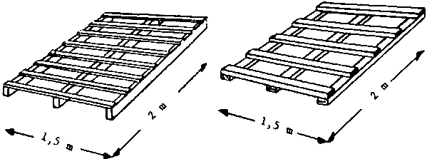 L'emploi de palettes sur lesquelles sont édifiées les piles est nécessaire lorsque l'étanchéité du sol du magasin n'est pas parfaite ou quand le centre de stockage est situé en zone humide. Les deux exemples de palettes illustrées à la figure IV.13 ont des dimensions réduites (1,5 m x 2 m) qui facilitent le transport. L'emploi de palettes dans les zones sèches n'est pas nécessaire en général.
