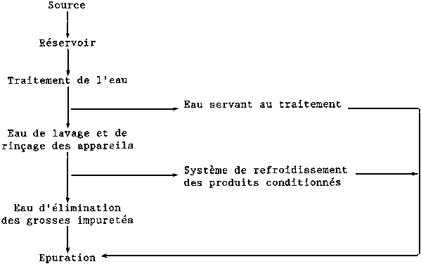 - utilisation échelonnée de l'eau: cette méthode consiste à réutiliser la même eau à plusieurs fins, comme le montre le schéma de la figure 65;- réemploi de l'eau après épuration. L'épuration, même si elle coûte cher, peut s'avérer avantageuse dans bien des cas si l'on tient compte du coût de l'eau fournie à l'usine, des pertes de matières premières de valeur pouvant être rejetées avec l'eau et des frais d'épuration des cours d'eau dans lesquels sont déversés les effluents d'autres utilisateurs.