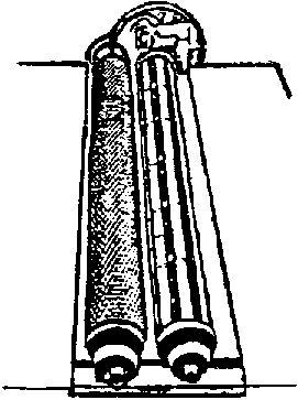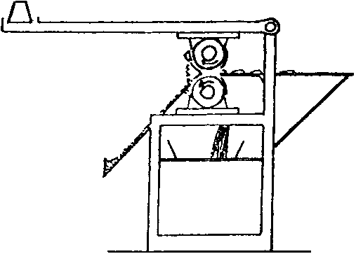 - presse à rouleaux (figure 22): la pulpe à presser est amenée manuellement entre deux rouleaux tournant en sens inverse et munis d'une gaine en caoutchouc de façon à être jointifs; prise entre ces rouleaux, la masse est écrasée et le jus séparé. Ce système fonctionne en continu et nécessite une personne pour assurer une alimentation régulière. Les cylindres sont entraînés par un moteur de 5 CV.