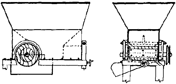 - broyeurs à marteaux (figure 15): plusieurs jeux de marteaux (jusqu'à 6) sont disposés radialement sur un rotor qui tourne à 1000-1500 tours/mn dans un carter muni d'une grille perforée semi-circulaire tenant lieu d'enclume. Les perforations de ces grilles interchangeables varient entre 3 et 5 mm de diamètre. Ce type de broyeur présente l'avantage d'une grande robustesse; il peut résister aux pierres et aux cailloux et être fabriqué localement;- broyeurs à couteaux: à la différence des broyeurs précédents, ces appareils sont munis d'une multitude de lames bien aiguisées fixées sur un rotor tournant à 1.000 tours/mn environ.