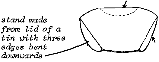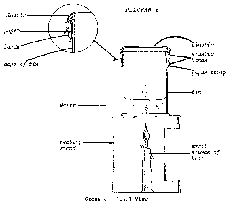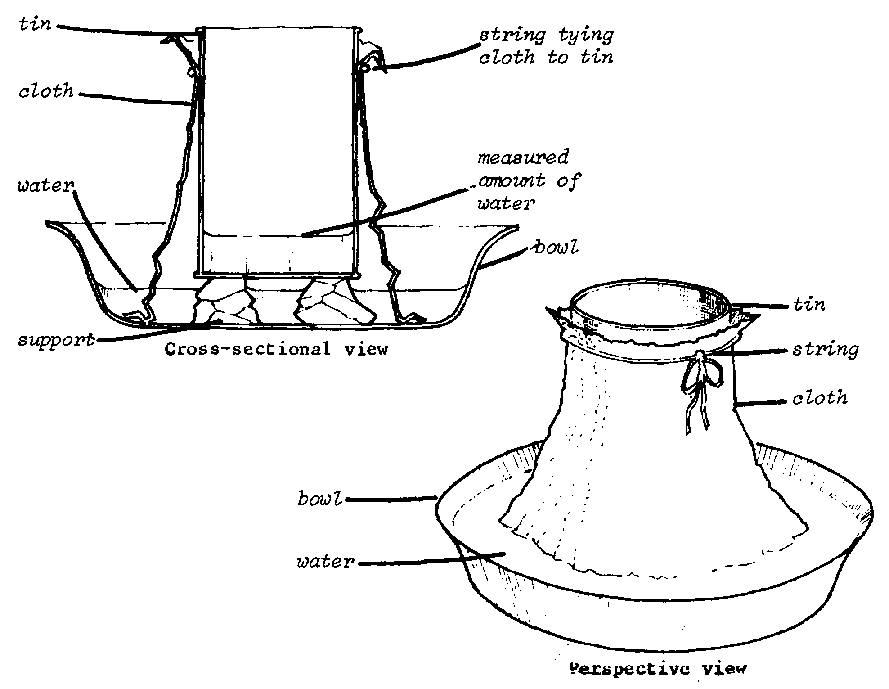 Procedure [or Group Four Choose two tins of the same size. Trace the top of one of them on paper to use in Activity I-2. Cut two round pieces of cloth about three times the height of the tin from the same piece of cloth. They need not be exactly round. Each sub-group in Group Four should use a different kind of cloth for its pair of tins if possible. Make a hole in the center of each cloth large enough so the open end of a tin can fit into it. Next, choose two trays or wide bowls that are several centimeters deep. As support, put three small stones, or a small short tin with a hole punched in its bottom, into each bowl. A tin will stand on this support. Put one cloth over each tin so the open end of the tin comes out of the hole. With string, tie the cloth onto the tin near the open top of the tin.