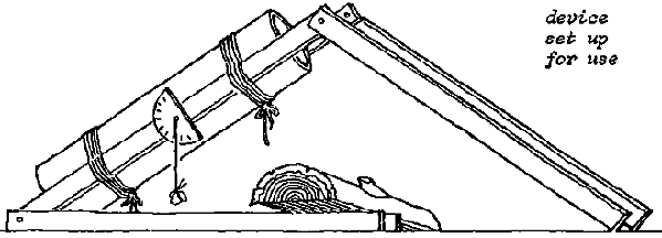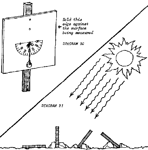 Draw a protractor on a square piece of cardboard. Attach a piece of wood to the cardboard as shown in Diagram 20. The nail at the center of the straight side of the protractor should stick out, so the string with a weight at the end can swing freely from it. If a bottletop is being used as a weight, hammer a small hole in it using a nail. Adjust the length of the string so the weight does not reach the edge of the cardboard in any position.