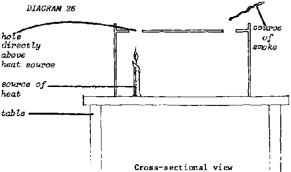 Procedure for Group Two Do the same experiment as is done by Group One, except use a box. If it poses a difficulty to make boxes, you can make tubes from paper and flatten one side as in Diagram 26. Have the tube lying horizontally, and close off both ends of the tube similar to the way the roof is used by Group One. Make two holes, one directly above the heat source, the second near the other end of the box or tube. Use a hot stone, hot charcoal, or a candle as source of heat. Test the flow of air by holding a piece of smoking string near each hole. Which way does the air flow? Make a diagram showing how the air flows.