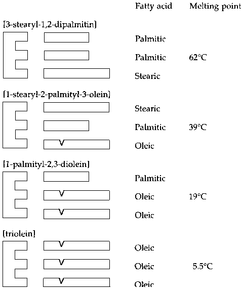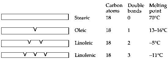 It can be seen that the presence of a double bond lowers the melting point. Thus, a triglyceride mixture containing a high proportion of monounsaturated or polyunsaturated fatty acids is likely to be liquid.