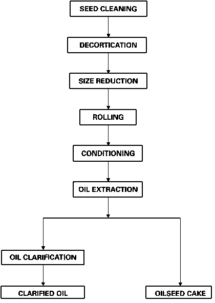 The following paragraphs are included to give the reader an idea of the scale and number of operations required to extract oil from oilseeds at a commercial level, and how they relate to small-scale operations. The main difference is that commercial mills refine the oil before offering it for sale as an edible product. It must be stressed that good quality unrefined oils produced by small-scale methods are in no way inferior to refined oils, and that they are, in many cases, preferred by the consumer as they retain the flavour of the oilseed.