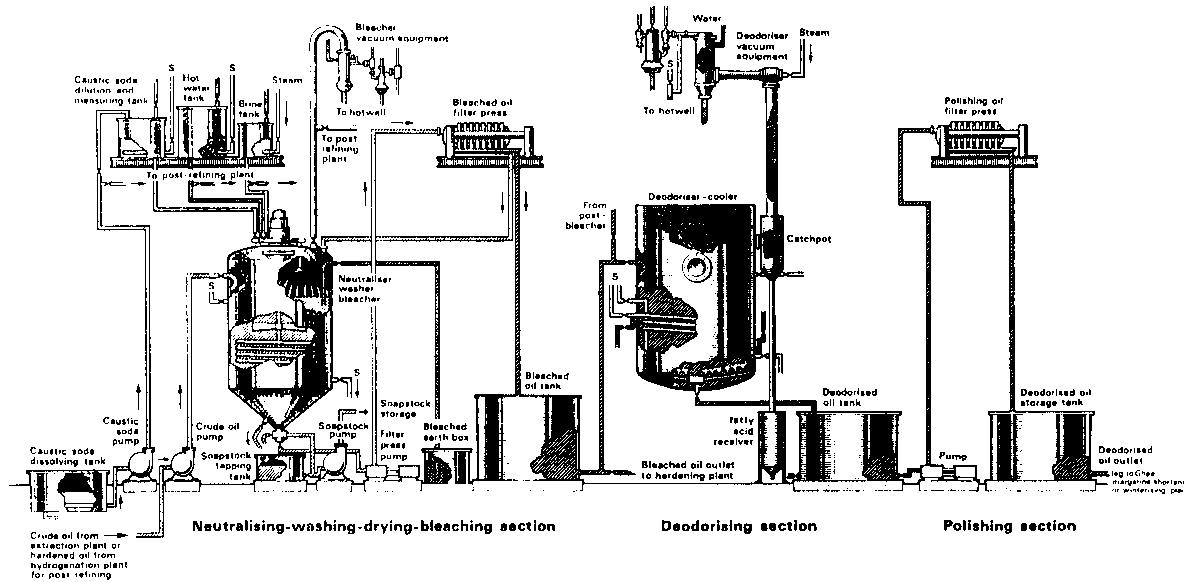 Crude oil is refined in three main steps, neutralization, bleaching and deodorizing, which remove fatty acids, colour, and off-flavours, respectively. Each of these processes involves heating the oil to a certain extent. The refining processes may be carried out in stages using batch plant (see Figure 3), or by using equipment providing continuous operation. The fatty acids are neutralized by mixing the oil with a solution of caustic soda. The caustic soda solution reacts with the fatty acids to produce soap which can be washed from the oil with water. The soap solution, known as soapstock, can be used for soap manufacture. The oil is then bleached by adding a powdered clay known as 'Fuller's earth'. This operation removes coloured pigments and produces a light-coloured oil. Deodorization is carried out by passing high pressure steam through the oil under vacuum to remove the taints and odours present in the oil at the beginning of the refining process, and those produced by the neutralizing and bleaching stages. A bland-tasting oil is finally obtained.