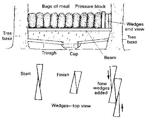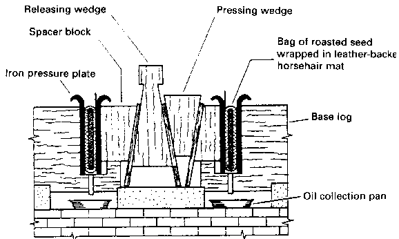 The wedge press, operated manually or by using either wind or water power, was widely used to press oilseeds during the late 18th and early 19th centuries in the West and in the Far East. The typical operating principle of a wedge press used during this period is shown in Figure 4. Figure 5 shows the design of a wedge press using trees as the end braces (Broadright, 1979). The wedges should be made of a very hard wood and are best driven in with a wooden mallet. Two wedges should be applied, one from each side, and these should be driven in simultaneously so as to avoid pushing both bags and wedges out of the press.