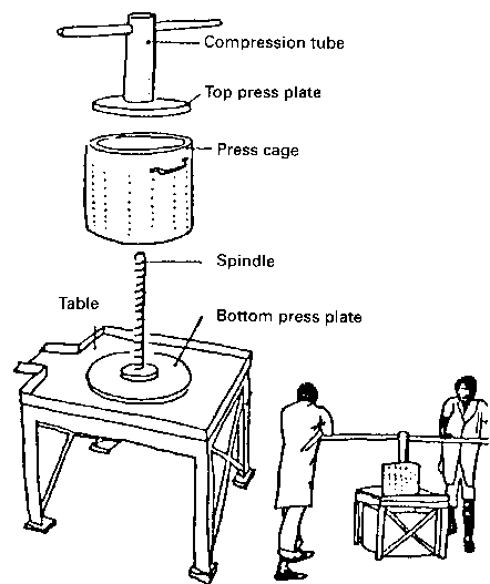 A selection of the many different types of manual press employed in oilseed processing are illustrated in Plate IV and Figures 4-10. With the exception of the ram press, these can be used for all types of oilseeds. To get the best oil yields, pressure on the prepared oilseed should be applied slowly and increased gradually.