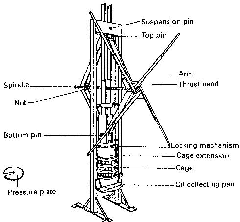 Figure 7 shows the bridge-type cage press used by NRI. The design incorporates a thrust bearing which allows the screwed rod to rotate easily against the pressure plate. The original press used a 24 cm diameter cage and was designed to produce the relatively low pressures required for extracting oil palm fruits. To adapt the press to higher pressure use so that it could be used for a range of oilseeds, the diameter of the cage was reduced to about 15 cm together with a corresponding reduction in the diameter of the press plate. This reduction in the cage diameter increased the maximum pressure exerted on the seed from the 14 kg/cm² (200 p.s.i.) available in the larger cage, to 34 kg/cm² (500 p.s.i.) in the smaller cage. The increase in pressure obtained can be demonstrated as follows.